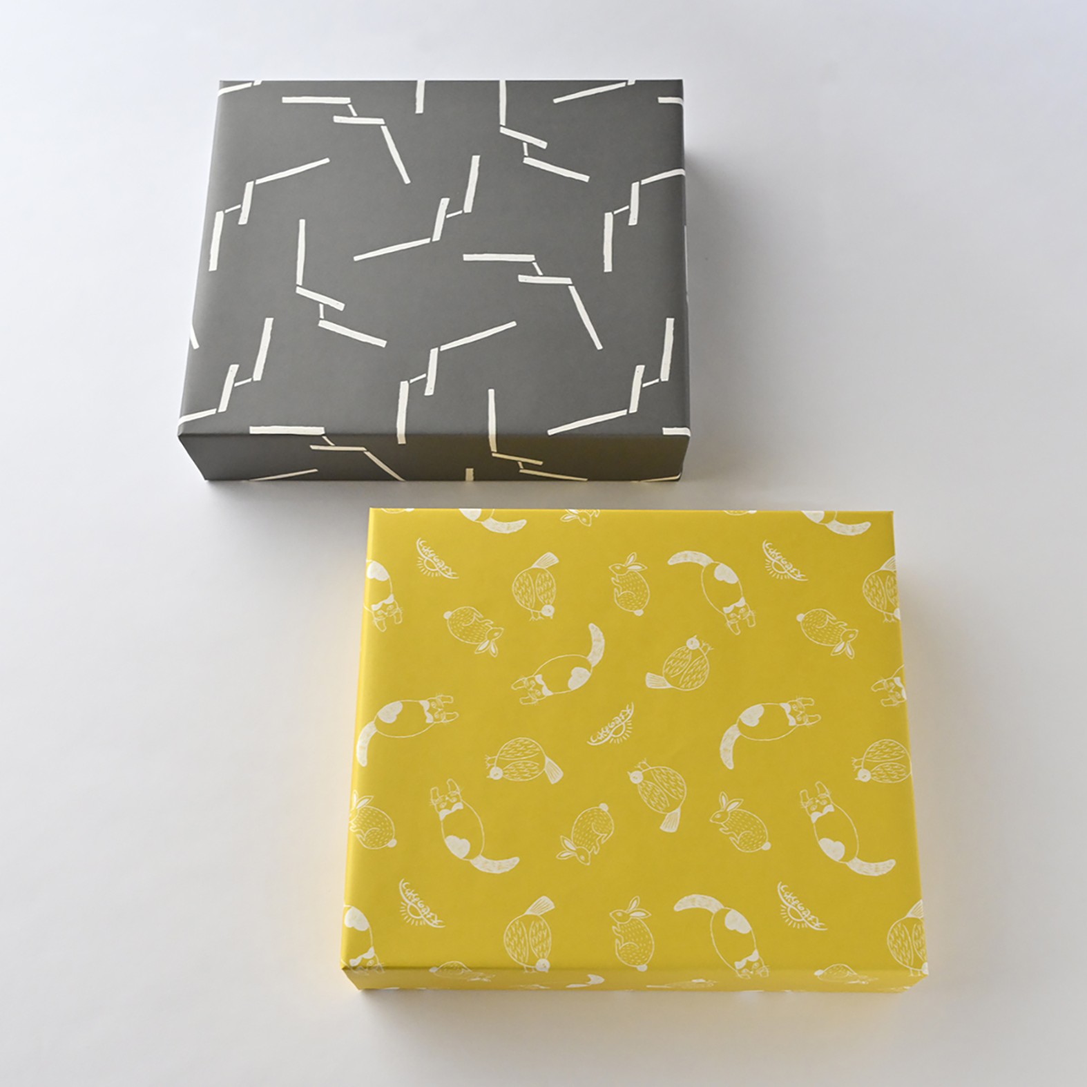 包装紙は2種類ご用意しております。お祝いには松尾ミユキさんのイラスト入り黄色い包装紙、ご法要にはグレーの包装紙でお包みします。またはお好みに応じてお選びください。